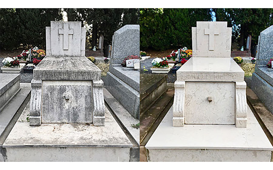 Les pierres tombales et monuments funéraires sont exposés en permanence aux agressions extérieures : humidité, mousses, pollution, rayons UV et passage du temps. Avec les années, ces éléments ternissent la pierre et altèrent l’aspect du monument.